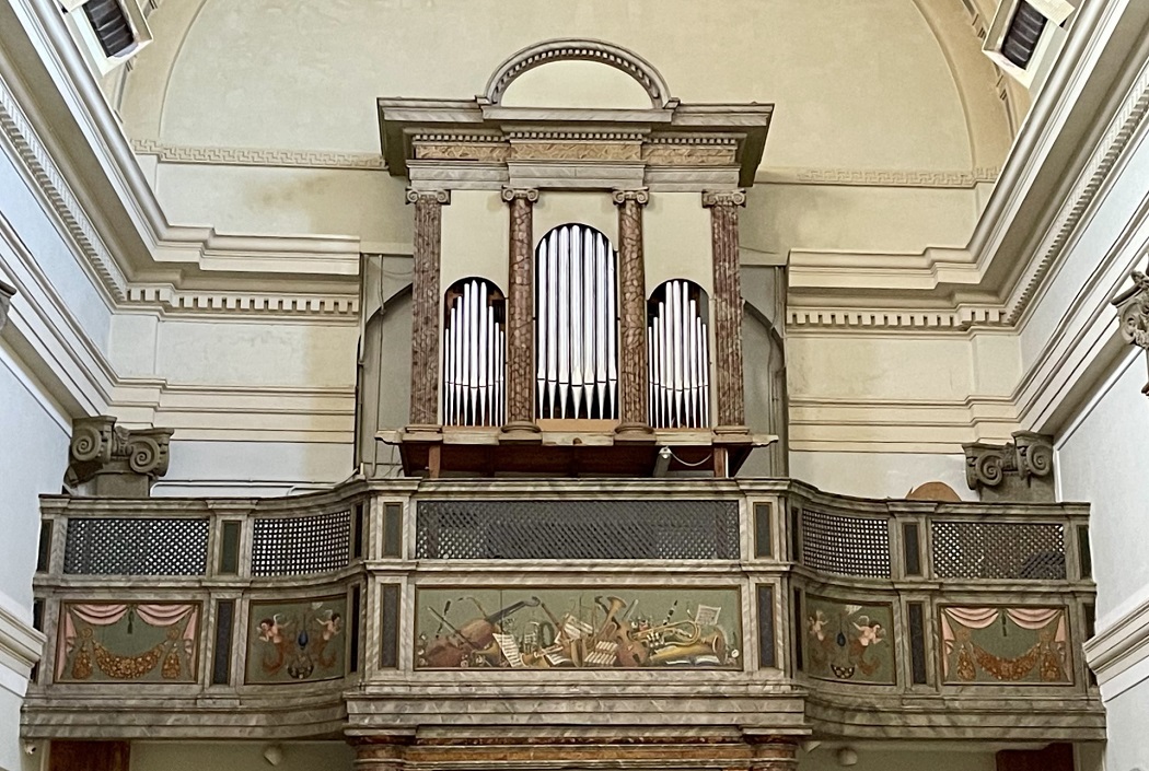Sopra l’ingresso di trova una cantoria in legno decorato che ospita un organo.