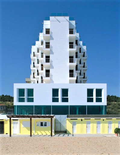 Il suo capolavoro assoluto è la rigenerazione di un albergo sulla spiaggia di Pesaro attraverso un intervento che ha trasformato una triste struttura tipica del boom della costa Adriatica in una icona da vivere.